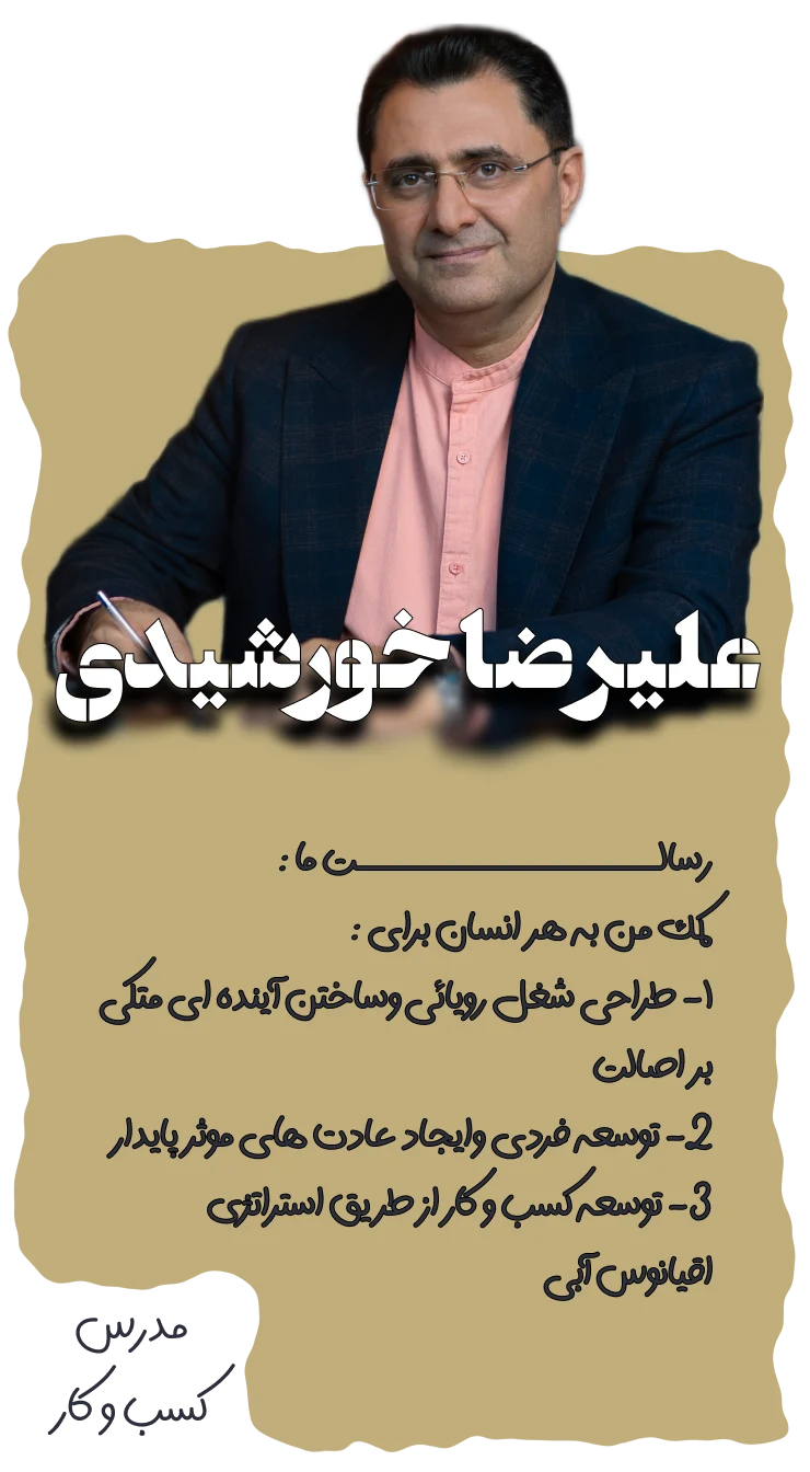 من عليرضا خور شيدى ، دوست دارم به ميليون ها انسان (اعم از افراد ، مدیران وصاحبان كب وكار ) كمک كنم شغل رویائى شان را کشف کنند و آينده شغلى و فردى خود را آگاهانه بسازند و كسب و كارشان را متحول نمايند: من معتقدم هرانسان سزاوار يک شغل رویائي است . اين كمک رابا تمام وجود و عشق از طريق طراحى مدل هاى گام به گام ، آموزش ، كوچينيگ ، ايجاد پلتفرم هاى توسعه فردى و شغلى ، تاليف كتاب و راه اندازى جنبش ” هرانسان یک شغل رويائى ” با تمركز عميق براقداماتى كه انجام مى دهم ، در راستاى نتیجه محور بودن مشاوره حركت خواهم كرد و بدين ترتيب به برترى و رضايت مندى نيز خواهم رسید.