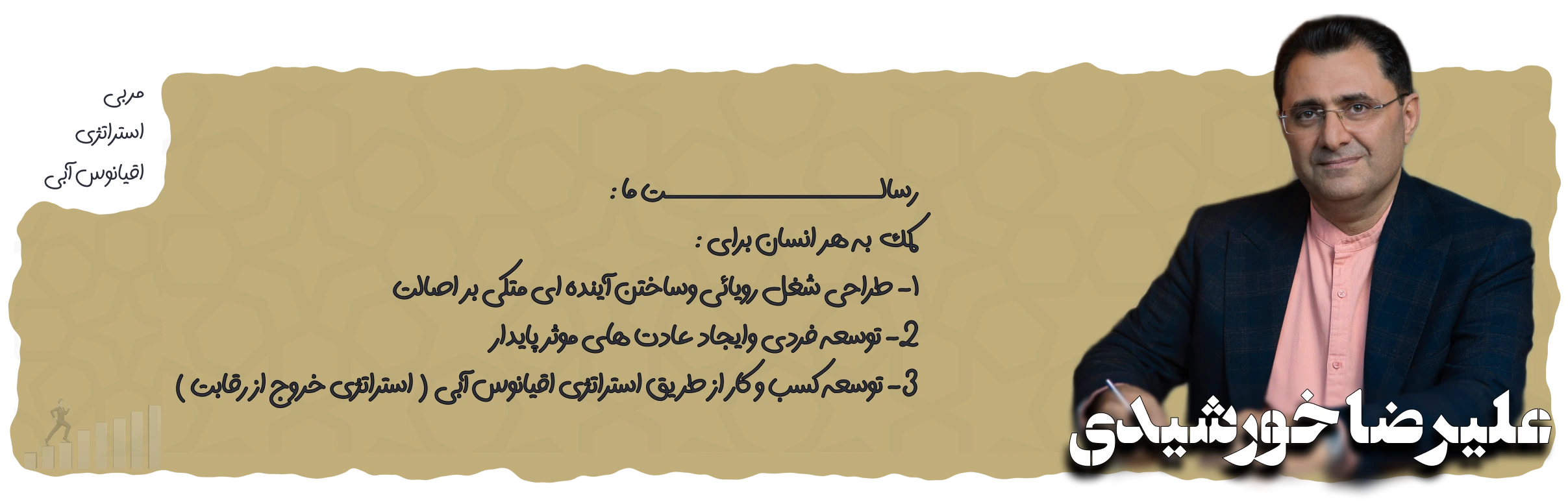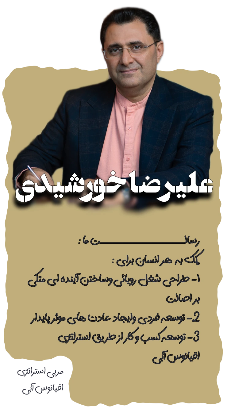 من عليرضا خور شيدى ، دوست دارم به ميليون ها انسان (اعم از افراد ، مدیران و صاحبان كسب وكار ) كمک كنم شغل رویائى شان را کشف کنند و آينده شغلى و فردى خود را آگاهانه بسازند و كسب و كارشان را متحول نمايند . من معتقدم هرانسان سزاوار يک شغل رویائي است . اين كمک را با تمام وجود و عشق از طريق طراحى مدل هاى گام به گام ، استفاده از ابزار تحلیلی درست و دقیق ، آموزش ، كوچينيگ ، ايجاد پلتفرم هاى توسعه فردى و شغلى ، تاليف كتاب و راه اندازى جنبش ” هرانسان یک شغل رويائى ” انجام مى دهم .